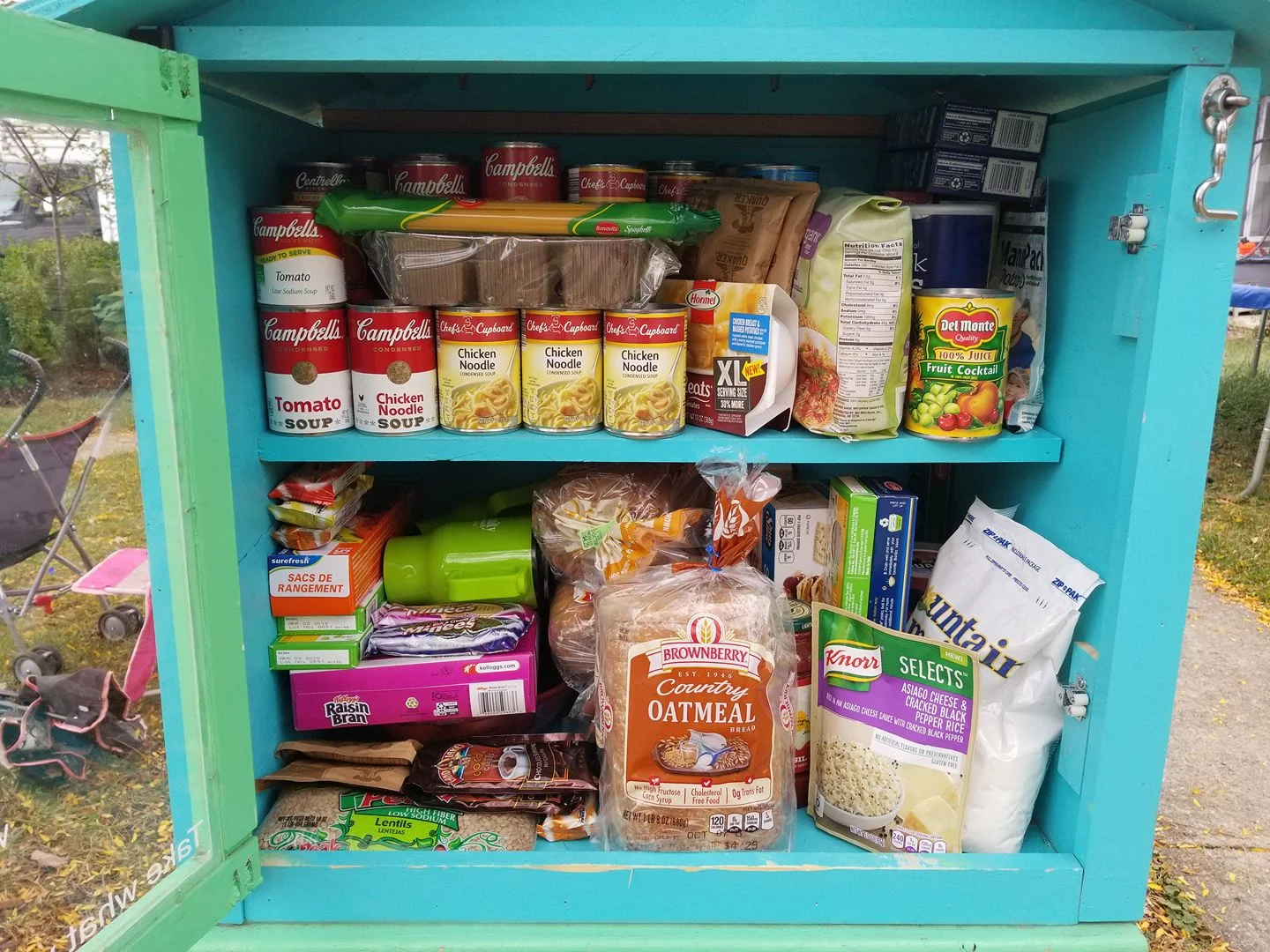 Emergency food supply is made available through these stand alone mini food-pantries. We keep these boxes stocked with non-perishables.